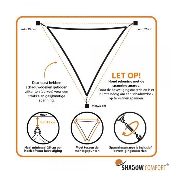 Ben je op zoek naar een stijlvolle en effectieve manier om schaduw te creëren in je tuin, op je terras of bij een speelplaats? Met dit driehoekige schaduwdoek van 3,6x3,6x3,6 meter kun je niet alleen genieten van een aangenaam koele plek, maar geef je jouw buitenruimte ook een moderne en frisse uitstraling. Dankzij het hoogwaardige materiaal, de veelzijdige toepassing en de strakke afwerking is dit schaduwdoek een onmisbare toevoeging aan elke buitenruimte. Let er wel op dat schaduwdoeken een curve hebben, zodat het doek goed opgespannen kan worden.