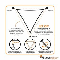 Ben je op zoek naar een stijlvolle en praktische oplossing om je buitenruimte te transformeren? Het driehoekige schaduwdoek van 3x3x3 meter biedt niet alleen verkoelende schaduw, maar voegt ook een modern accent toe aan je tuin, terras of veranda. Of je nu wilt ontspannen met een boek, genieten van een gezellige barbecue of gewoon beschermd wilt zijn tegen de zon, dit veelzijdige schaduwdoek maakt het mogelijk. Ontdek de unieke voordelen van dit schaduwdoek en maak van jouw buitenruimte een stijlvolle en comfortabele plek om te genieten. Let er wel op dat schaduwdoeken een curve hebben, zodat het doek goed opgespannen kan worden.