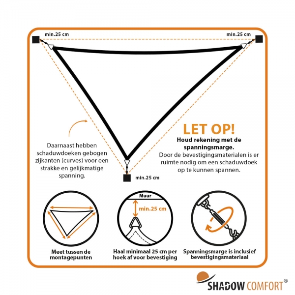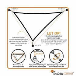 Geniet van aangename schaduw in jouw tuin of op het terras met dit schaduwdoek in driehoekige vorm. Met een afmeting van 5x5,5x6 meter biedt dit doek een stijlvolle én functionele oplossing tegen de felle zon. Dankzij het hoogwaardige materiaal is dit schaduwdoek duurzaam, waterafstotend en eenvoudig te installeren. Let er wel op dat schaduwdoeken een curve hebben, zodat het doek goed opgespannen kan worden.
