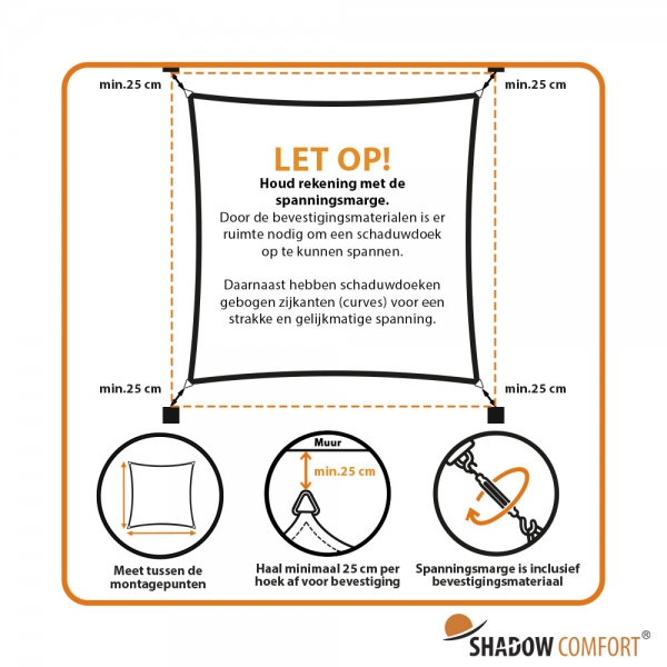 Het schaduwdoek vierkant 2x2 is perfect voor compacte buitenruimtes zoals een balkon of kleine patio. Het ademende HDPE-materiaal houdt je koel en beschermd tegen UV-straling. Dankzij de RVS-bevestigingspunten hangt het doek stevig en eenvoudig op zijn plek. Let er wel op dat schaduwdoeken een curve hebben, zodat het doek goed opgespannen kan worden.