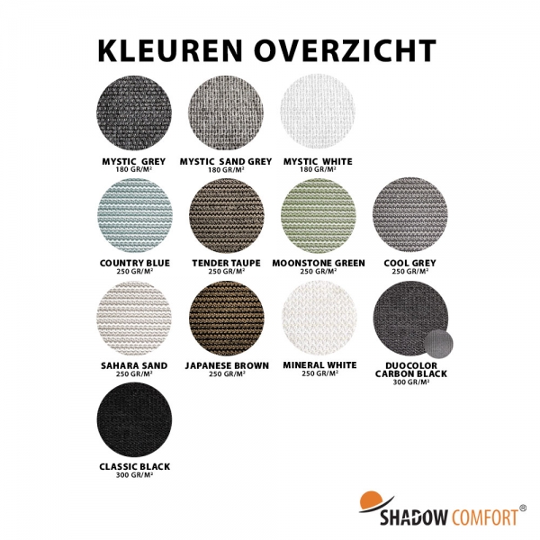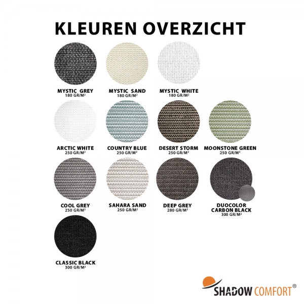 Bij Nettenverkoop vind je 10 verschillende kleuren schaduwdoeken van 5x5 meter die binnen 2 werkdagen bij jou thuis worden geleverd!