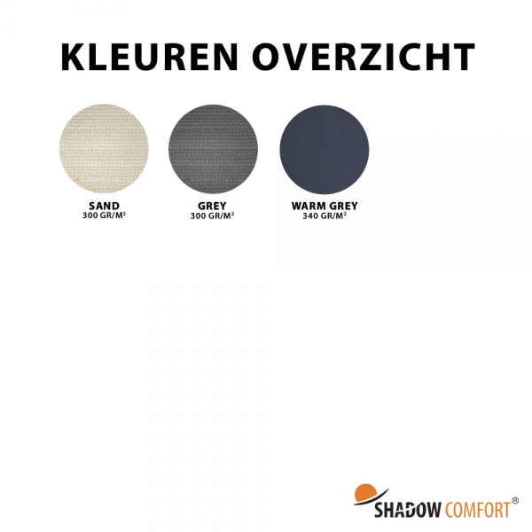 Deze waterdichte / waterafstotende kwaliteit dien je op minimaal 30Ëšafschot te hangen om voor een goede afwatering te zorgen. Naast de bescherming tegen water filtert een waterafstotend schaduwdoek ook schadelijke UV-straling. Dit geeft je dus een extra comfortabel gevoel. Dankzij impregnatie beschermt deze stof dus ook tegen alle kleine regenbuien. Bij storm of zware windstoten adviseren we om het doek te demonteren. Met een katrolset van Shadow Comfort demonteer je het schaduwdoek in een handomdraai. Naast deze katrolset heb je ook keuze uit diverse RVS bevestigingssets zodat je ten alle tijden uw Shadow Comfort schaduwdoek probleemloos kunt monteren of demonteren.