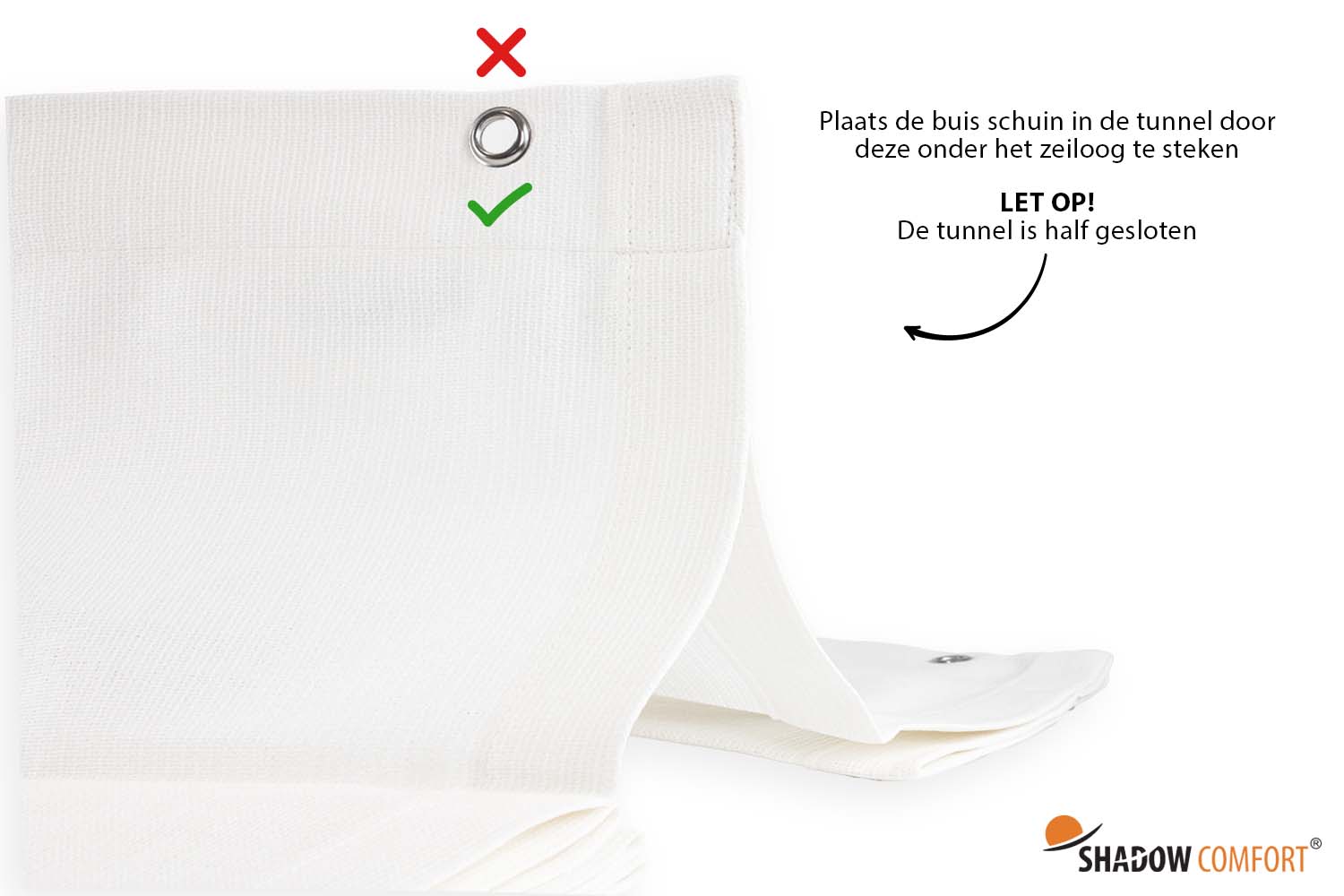 LET OP!!! aluminium buizen onder de zeilogen plaatsen. Zijkant tunnel is een beetje ingestikt zodat de buizen bij harde wind er niet uitwaaien. Bij het installeren van de buis maakt u als het ware een kleine bocht naar onderen zodat de buis onder de zeilogen komt.